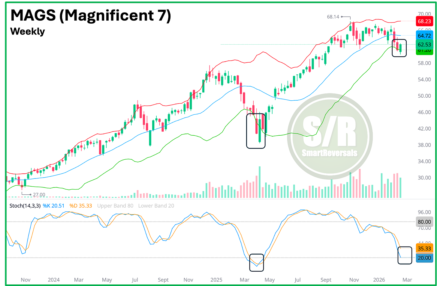 The weekly chart for the MAGS ETF (Magnificent Seven) suggests the worst of the bearish move may be behind us. The lower Bollinger Band was breached and oscillators reached oversold territory, conditions that mirrored the April 2025 bottom.