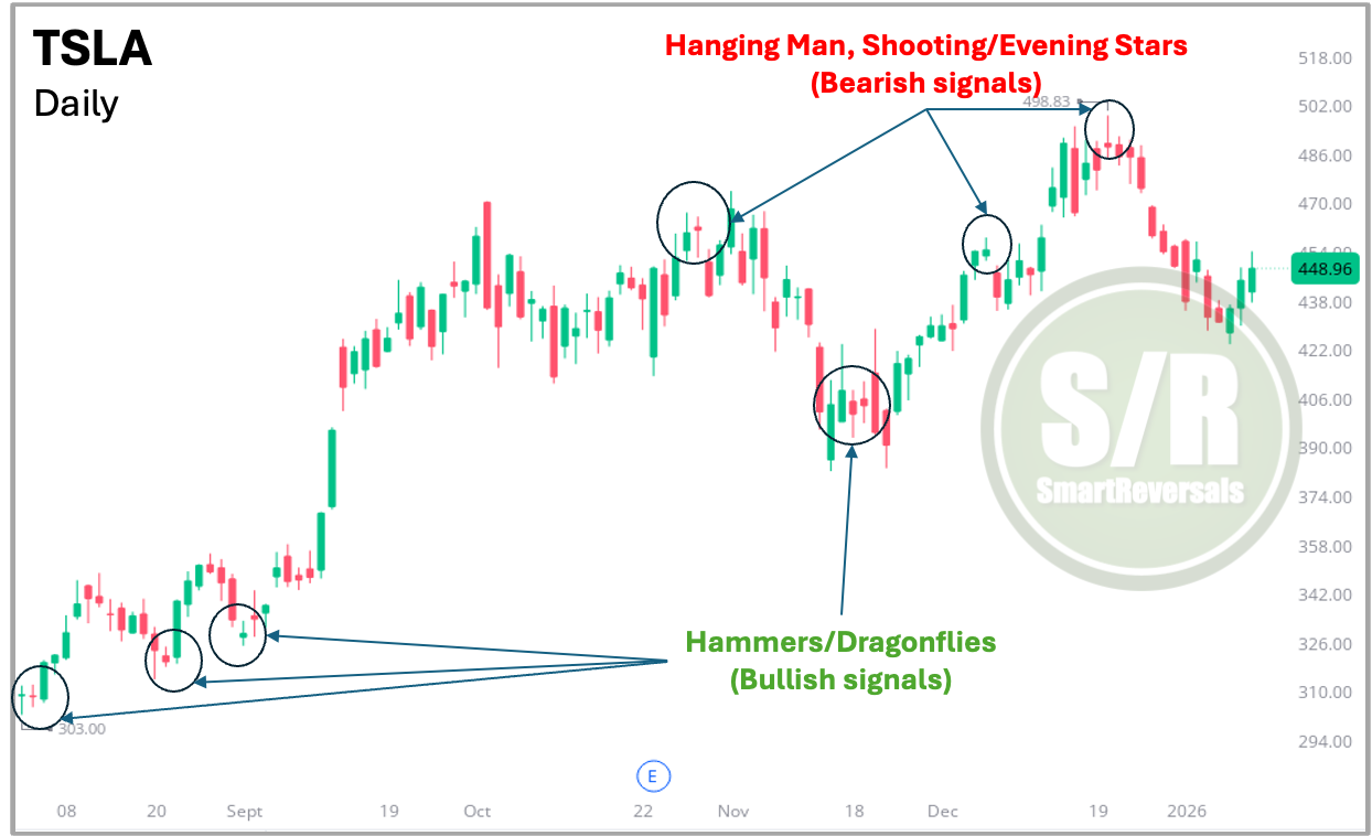 As shown in the chart below, well-known formations such as Shooting Stars, signaling bearish pressure, and Hammers, indicating bullish strength, can help anticipate intraday reversals before they evolve into broader trends. Recognizing these patterns allows traders to detect exhaustion during rallies or consolidation after declines, providing a clear advantage in decision-making.