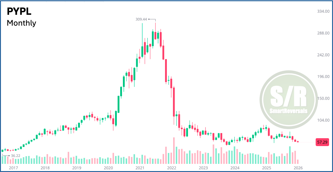 PayPal (PYPL) is a prime example of this divergence. Despite boasting robust fundamentals and over $8 billion in revenue, the stock has been excessively punished. Five years after being a market favorite, it currently trades at just one-sixth of its 2021 peak. This illustrates why relying on fundamentals alone is often insufficient.