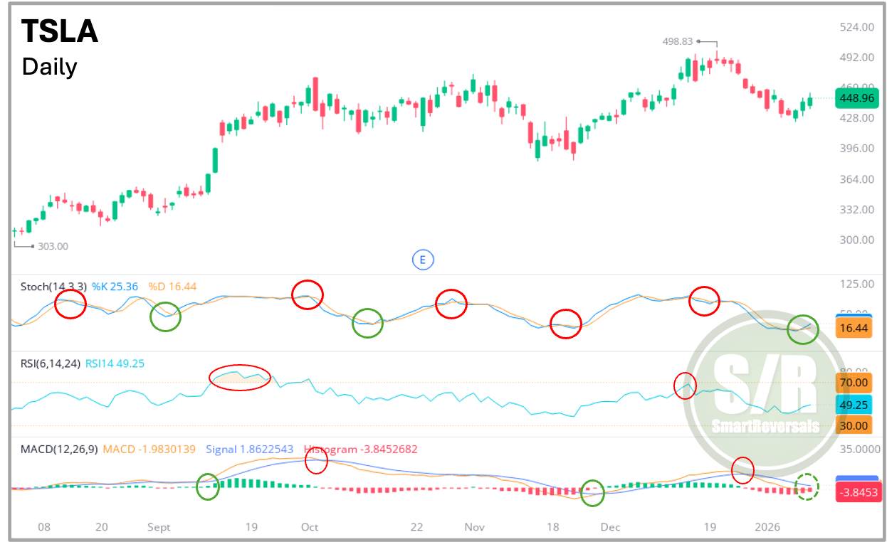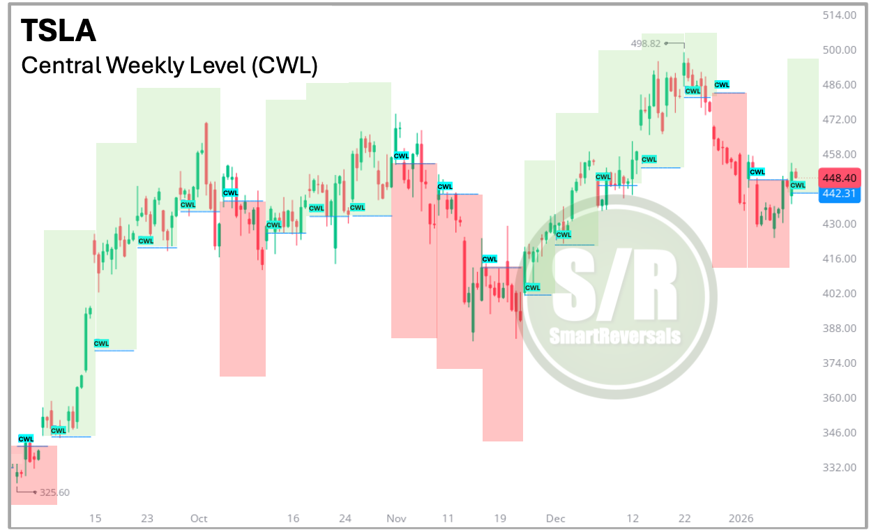 As a final refinement, rather than waiting for a loss of the Central Monthly Level (CML) or a breakdown of the 10 or 20 Moving Averages, I rely on the Central Weekly Level (CWL). Updated every Friday for the week ahead, this level provides a precise reference point for evaluating short-term price behavior. The CWL helps confirm whether a pullback is forming, particularly when price is overbought and then falls below this level, or whether a bounce is gaining strength, as illustrated in the TSLA example shown below.