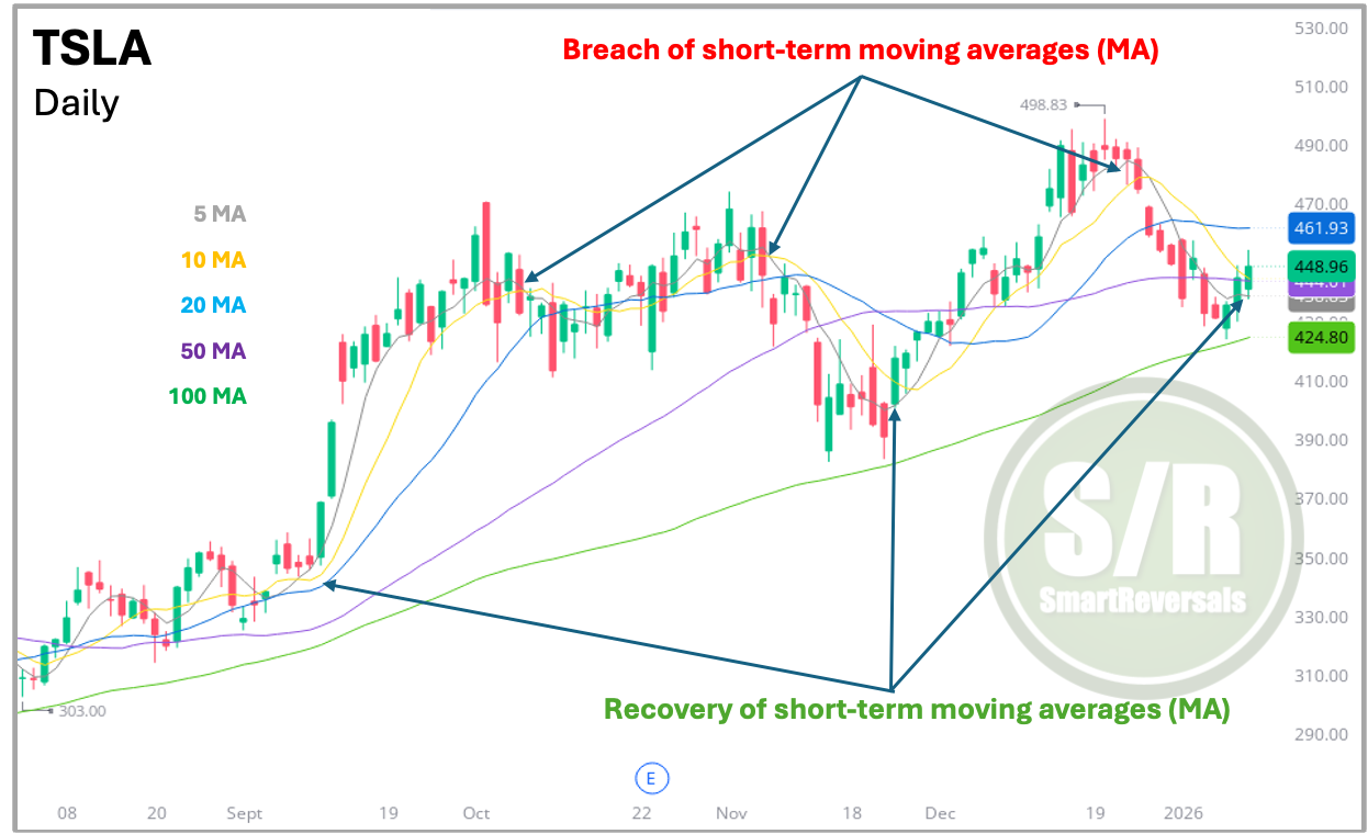 For some traders and investors, a break below the 5 and 10DMA may be viewed as a potential sell signal, while a recovery above them could suggest a buying opportunity. This example is not meant as a rigid rule since each stock presents different price behaviors, but rather as an illustration of how clearly defined criteria can enhance Moving Average analysis and promote disciplined decision-making.