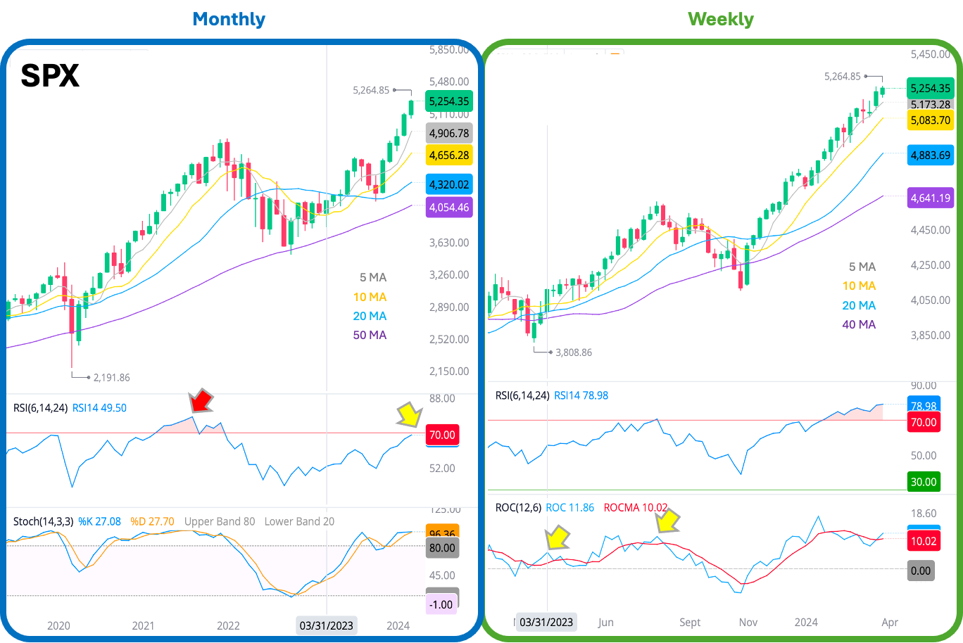 The Monthly RSI is approaching 70, a level requiring caution and close attention to reversal signals. Interestingly, the current level of overbought RSI is not as extreme as it was in 2021. This doesn't guarantee the same level of overbought conditions will occur, but it offers a perspective on the current price action.