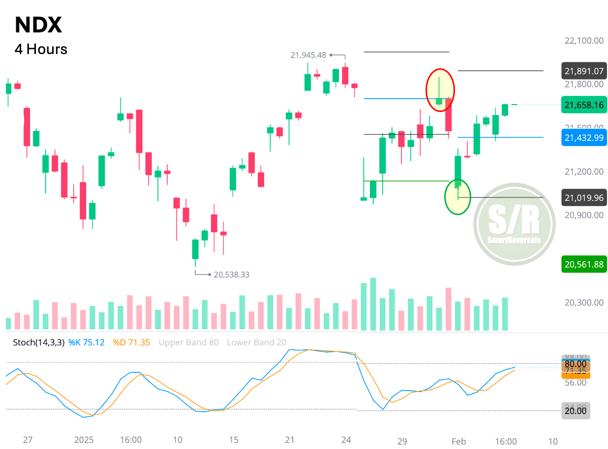 Similarly, the Nasdaq 100 (NDX) reached its bearish target zone of $21,019 on Monday, where the price found a floor and initiated a bounce. Right now the central level has been recovered and price action shows conviction for a green Thursday. Be mindful of green reversal candles, since that happened on December 26th after a setup that looked bullish. Managing risk using $21,432 as a reference is prudent, and similar to SPX, if that level is lost, $21,019 is the minimal bearish destination. All eyes on AMZN.