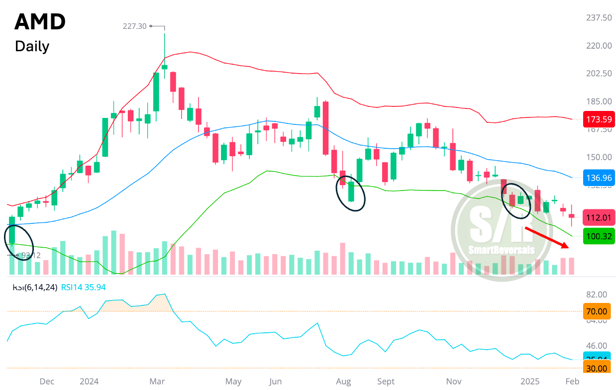 The fact that price is far from the Bollinger band adds bearishness to the chart. $108 acted as support, $112 was the expectation for bearish target but weak earnings sent price to the next bearish level and the intra day bounce found rejection at $112.3, a level that has to be recovered to expect a bounce. (REMEMBER THAT EVERY LEVEL I MENTION HERE WAS PUBLISHED IN ADVANCE LAST FRIDAY). The bright side for AMD is the daily chart, where the Bollinger low has been visited, so a technical bounce is likely. Subscribers know that after $112, the level to watch is $116.4.