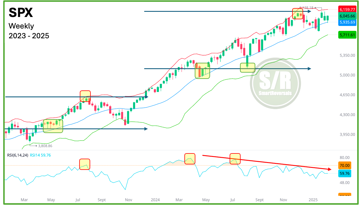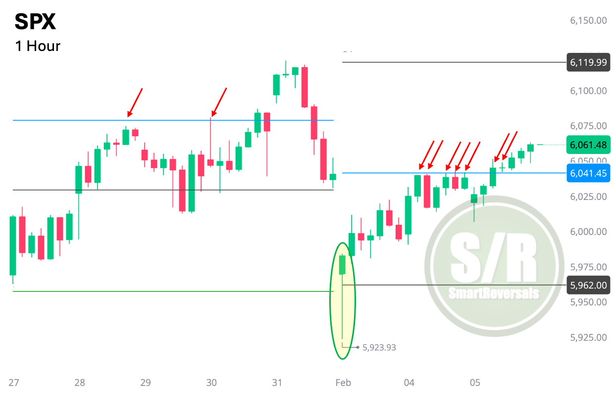 The S&P 500 (SPX) found solid support at $5962, as projected, before rebounding to $6041, where it encountered resistance yesterday and today price action finally crossed that line. This interaction with pre-defined levels underscores their predictive power for price consolidations or reversals.