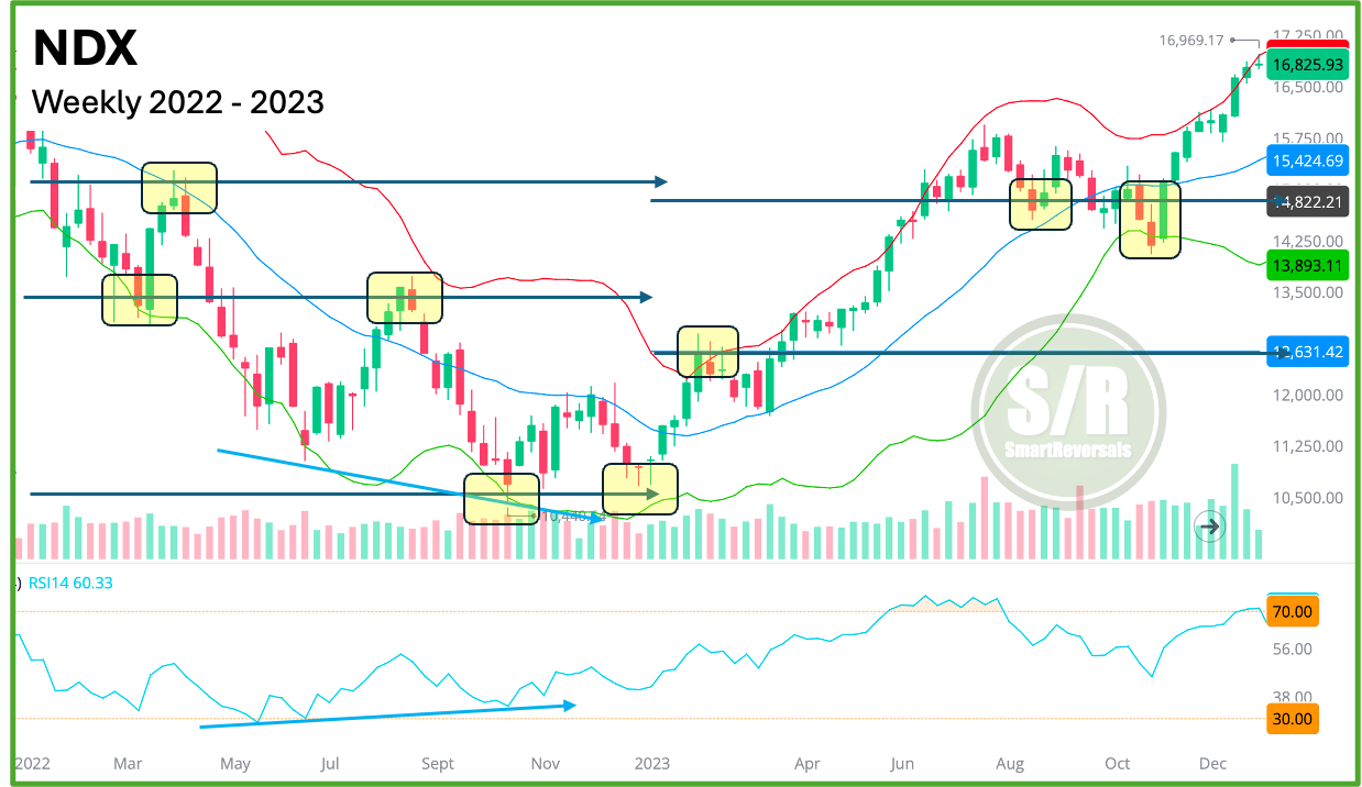 Backtesting this approach, the case is the same for NDX, with bearish reversals in 2022 as highlighted below, and the very bottom of the bear market was in an annual support level. In both charts the use of RSI and Bollinger bands has been essential.