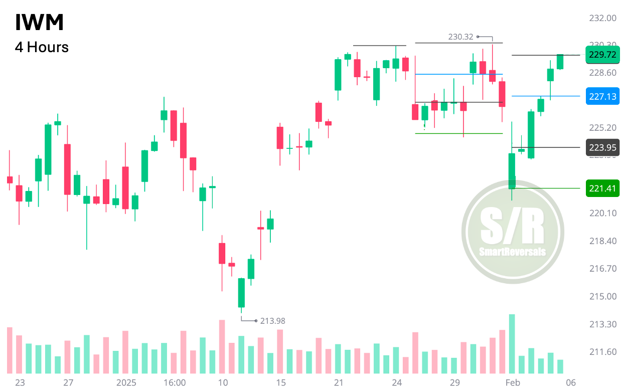 Since the latest price action shows conviction, risk management continues around $227.3 for longs, and the candles are suggesting $232.8 is the next level on sight. That would be possible only if the market is not impacted negatively by AMZN. Yes, that is not a small cap, but IWM usually suffers the moves of the big indices.