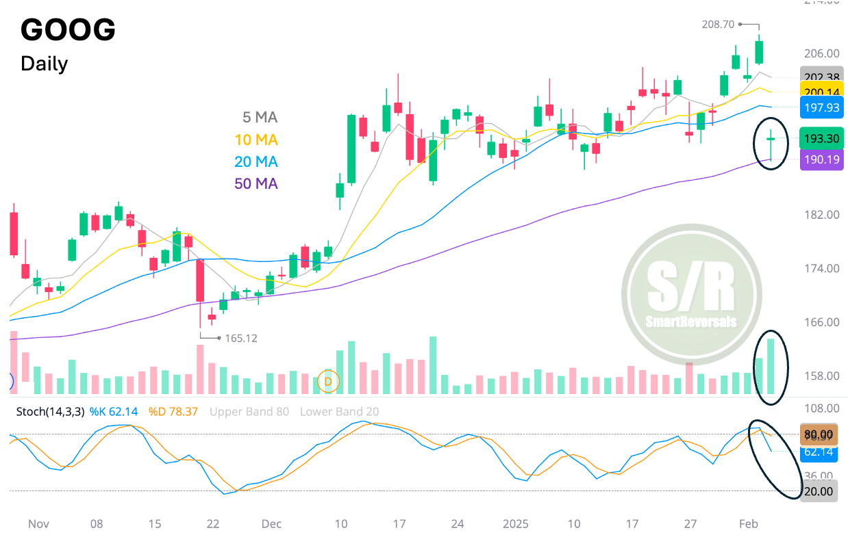 Today’s dragonfly candle suggests a reversal considering volume validation and the bounce from the 50DMA, the gap will be filled, but Stochastic suggests the move is not over. Let’s use the levels: The dragonfly is at $193.8, a monthly support level, it may be a reversal zone, and $196 should be overcome to validate that thesis, if it doesn’t happen the bearish move should find support at $187.