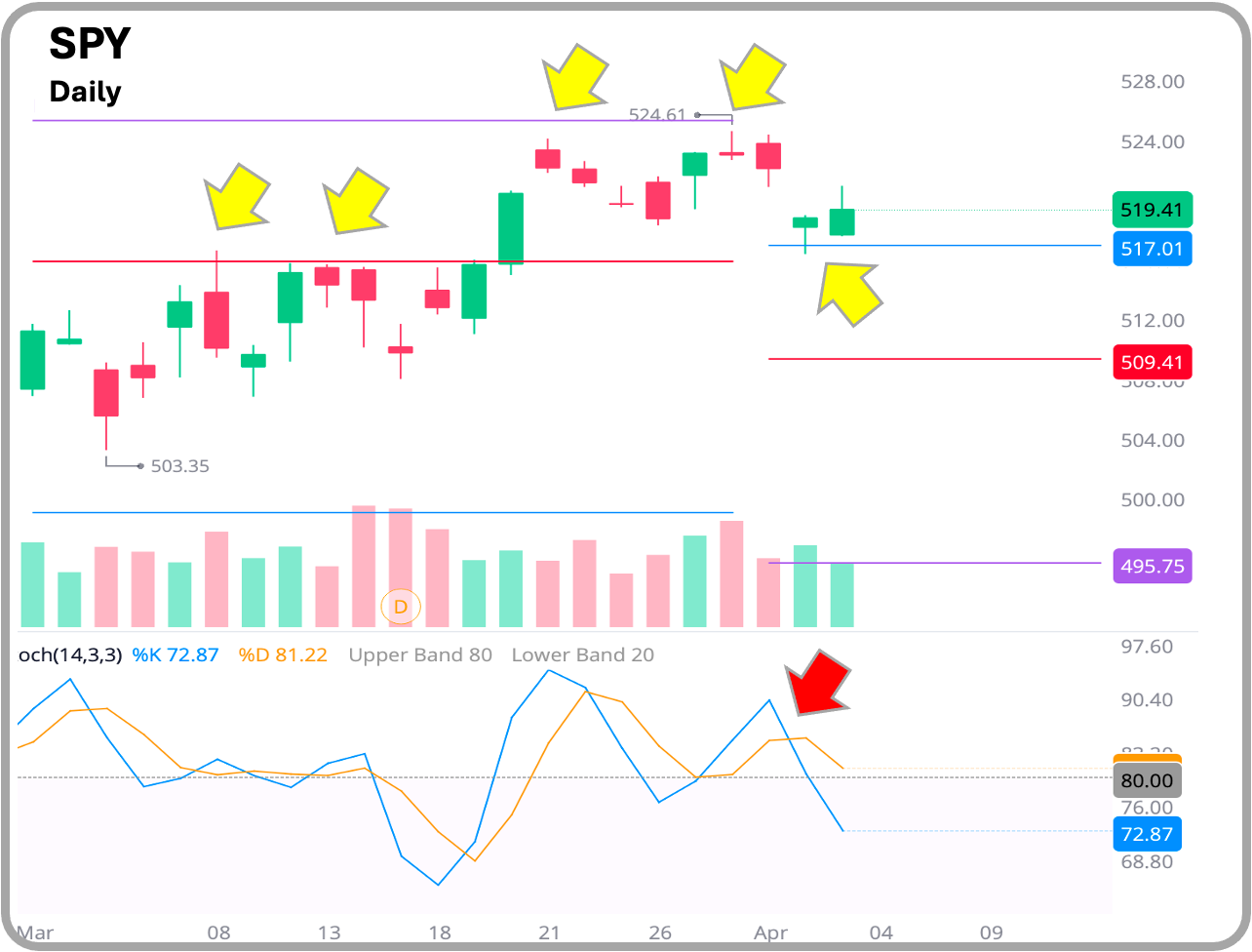SPY (Daily): Multiple Tests and Reversals The next examples for SPY shows several attempts to cross the $516 level in March; after 6 occasions price finally jumped above that level, just to find rejection close to $525 and sealing a decline with a gravestone. The following week, $517 provided support. Bear in mind that these lines are provided ahead of the week, they are not included in the chart after the price action occurred.