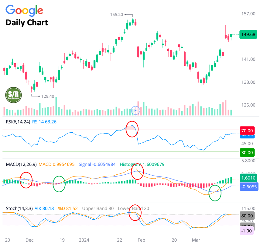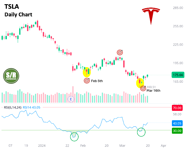 With the Relative Strength Index (RSI): A security is considered oversold when the RSI reading drops below 30. The TSLA Daily Chart shows the RSI falling into the oversold zone (below 30) on two occasions (Feb 5th and Mar 16th), both of which signaled a price bottom before a bounce.