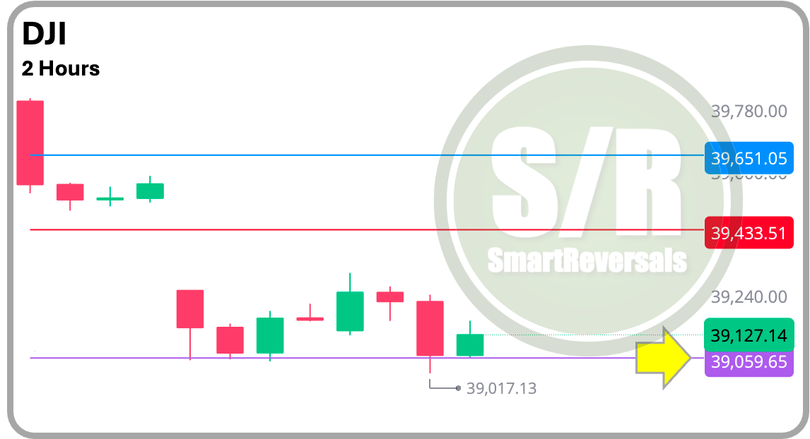 DJI (2 Hours): Breaching the Central Level This two hours timeframe for Dow Jones shows how $39,651, the central level was breached with a conviction candle (belt hold), price started a decline that ended in the second support level (there are 3 resistance and 3 support levels next to the central level provided, in this case $39,059 supported price: