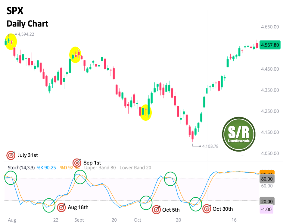 With the Stochastic Oscillator: A security is considered overbought when the oscillator reading goes above 80. On the SPX Daily Chart, the yellow circles (like on July 31st and Sep 1st) highlight where the Stochastic crossed above 80, signaling overbought conditions that preceded a price decline.