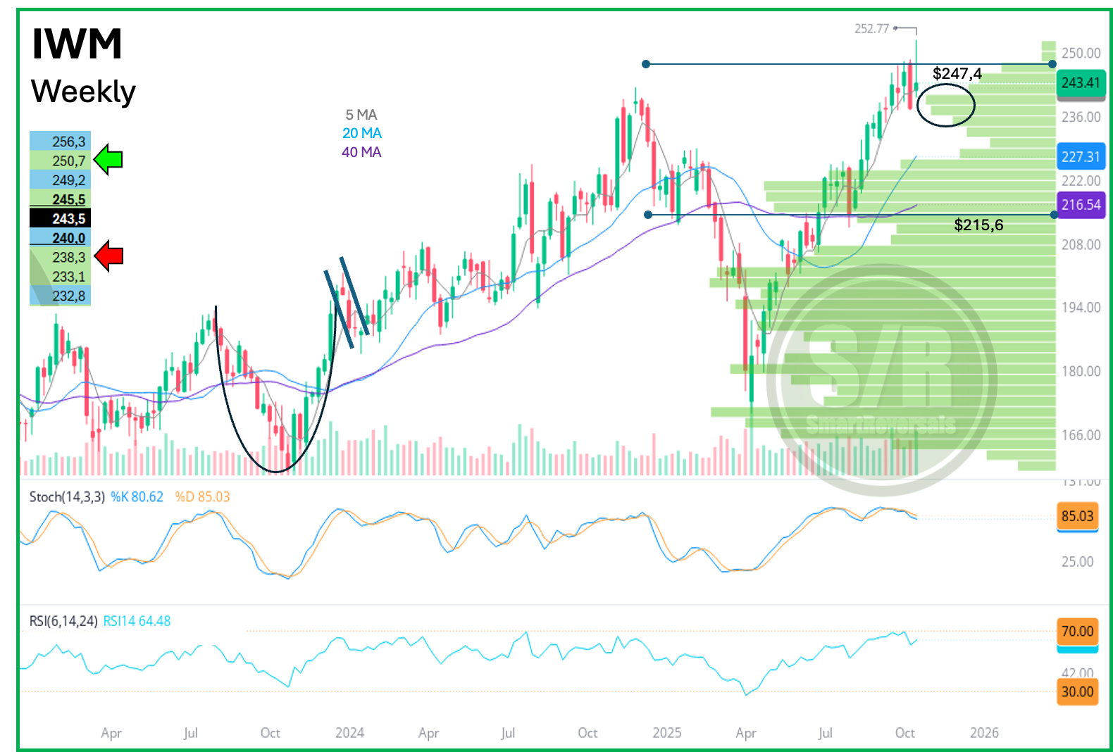 The IWM reached new all time highs, and the $247 price mark that currently is suggesting a healthy pullback before bullish continuation as presented to premium subscribers with more technical rationale.