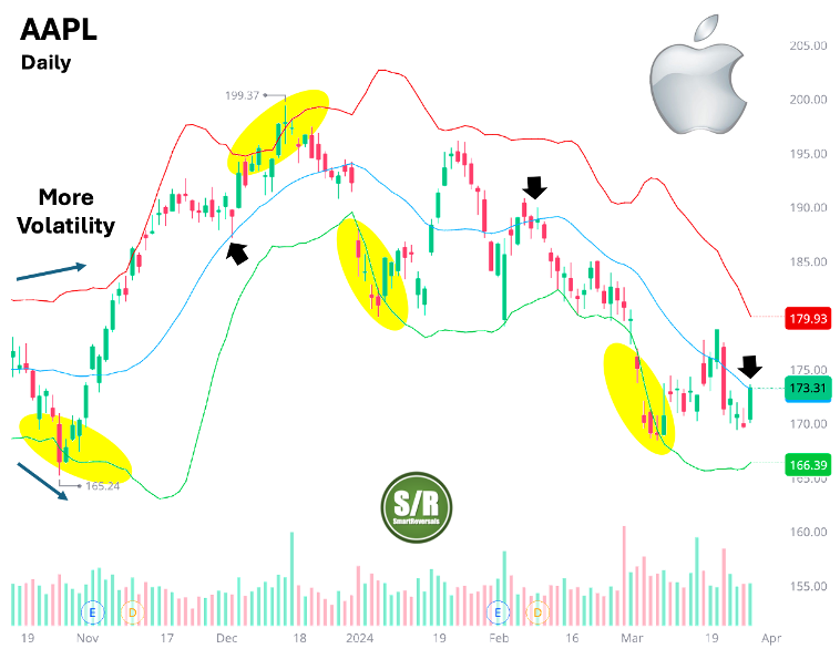 With Bollinger Bands: A price is considered relatively overbought when it touches or moves above the upper Bollinger Band. The AAPL Daily Chart shows a period in December 2023 where the price pushed above the upper band, which was followed by a price reversal back toward the middle band.