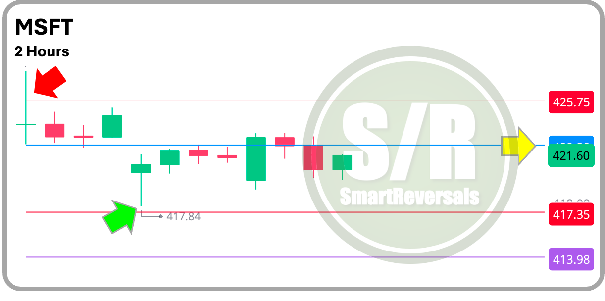 MSFT (2 Hours): Candlesticks at S/R Levels See the following example for MSFT, and the first candle that opened the month of April finding rejection at $425... The shooting star found rejection at $425.7, price moved down to the $417.4 level finding support, printing a hammer candle that suggested bullish bias, anyway the central weekly level invalidated the bullish thesis in this example at $422.