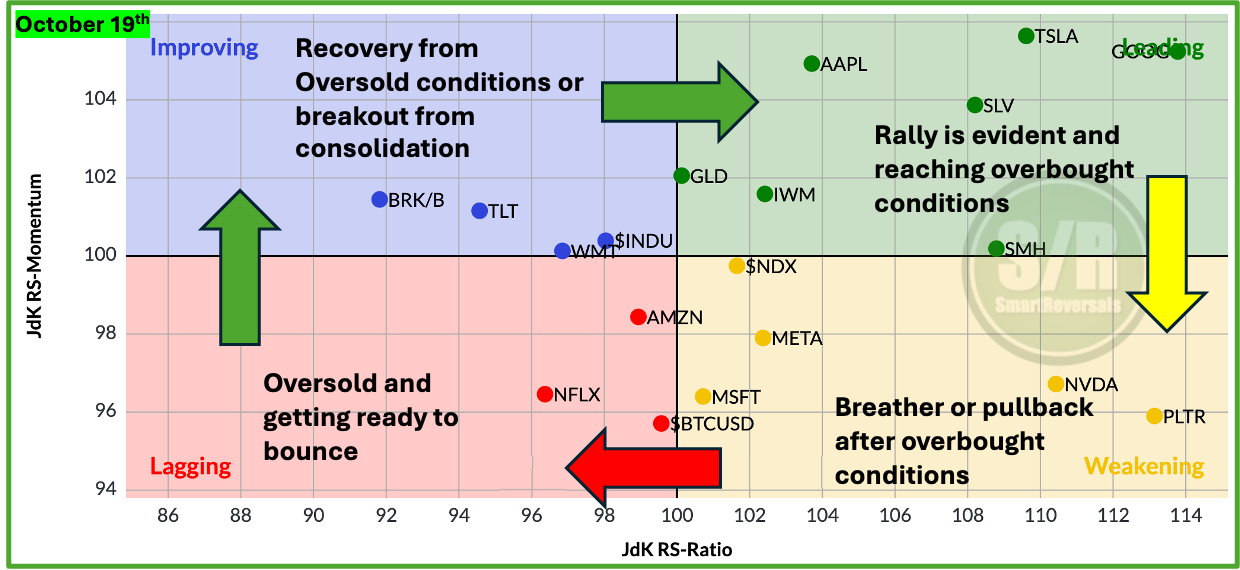 The following rotation map from the Weekly Compass posted on October 19th, shows the position of each security we study relative to the SPX, with AAPL and TSLA in a strong position, NVDA in a pullback process, and NFLX in a weak position.