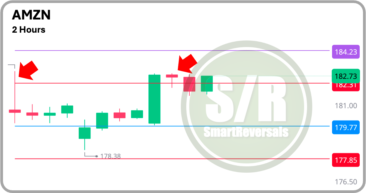 AMZN (2 Hours): Candlestick Warnings Check the green long candle... the $182 level was temporarily crossed just to retrace and drawing a shooting star candle. Two days later there is another bullish attempt but a hanging man warns about a retrace. AMZN and MSFT provide example of choppy price action but they’re useful to highlight candle formations at S/R lines.