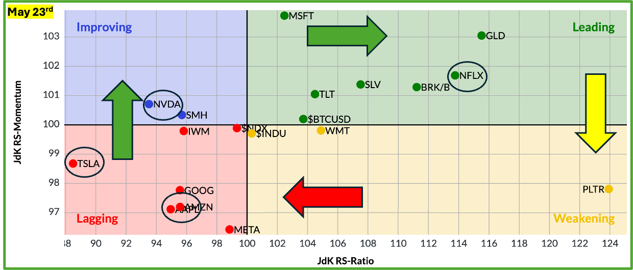 The second rotation map below, from May 2025 presents a different picture, back then NFLX was the darling, while AAPL and TSLA were laggards, and NVDA was just in the beginning of its rally. Momentum changes and that’s what we monitor in the Weekly Compass!.