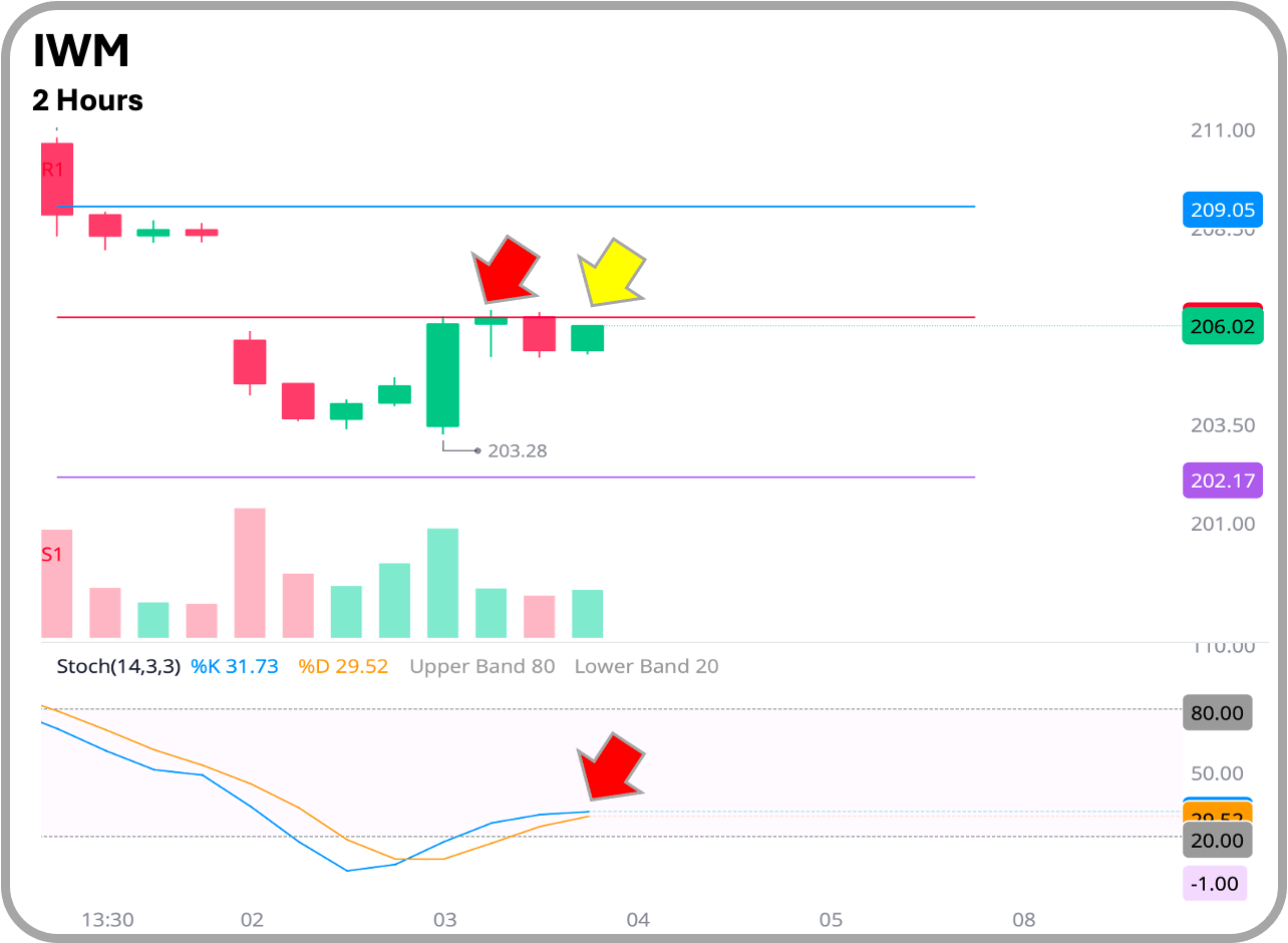 IWM (2 Hours): Combining with Oscillators Use support and resistance levels in conjunction with other technical indicators like moving averages, RSI, or MACD for confirmation. IWM observed resistance at $206.2, four failed attempts to cross it or four candles stopping their move at that level validates its significance in the chart, on the other side the Stochastic oscillator starts to curl down indicating momentum is fading and reducing probabilities of a price jump.