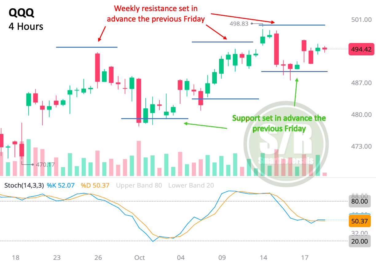 The levels provided every week are calculated ahead of time, the levels have proven to work, this example for QQQ (one of the 44 securities provided), shows weekly S/R levels provided the previous Friday before the price action actually happens.