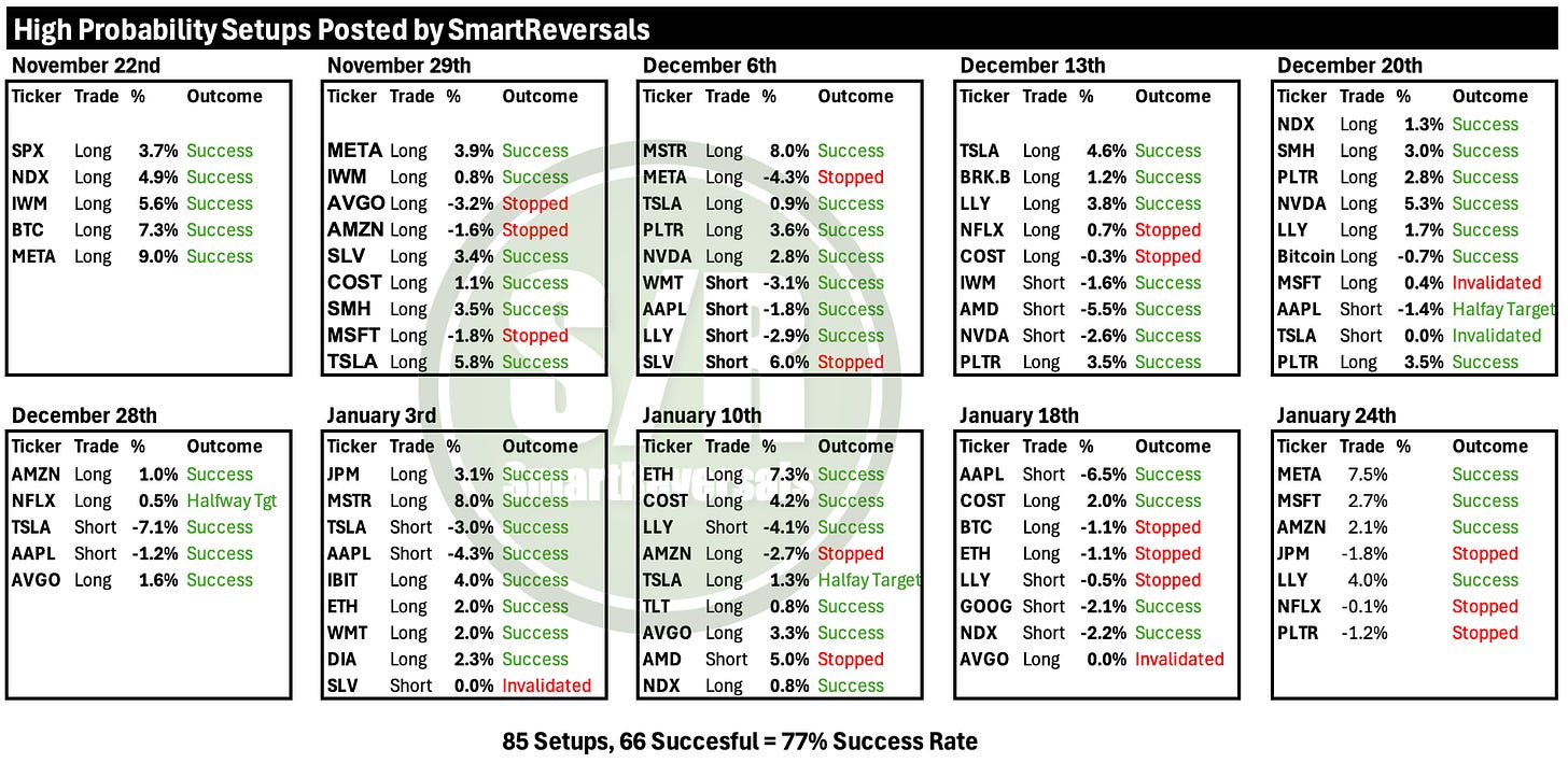Last week, our High-Probability Setups continued to outperform, maintaining a cumulative accuracy record of 77%. We correctly identified moves in META, MSFT, AMZN, LLY, and IWM, securing an average gain of 4.1% across bullish and bearish setups. Even our invalidations (NFLX, PLTR, JPM) were cut short with a minimal -1% average loss. This edge comes from a deliberate choice: we trade a constant universe of high-volume, blue-chip securities. My focus on liquid giants ensures our orders get filled and our technical analysis remains reliable. Join the paid plan today to trade with institutional-grade precision.