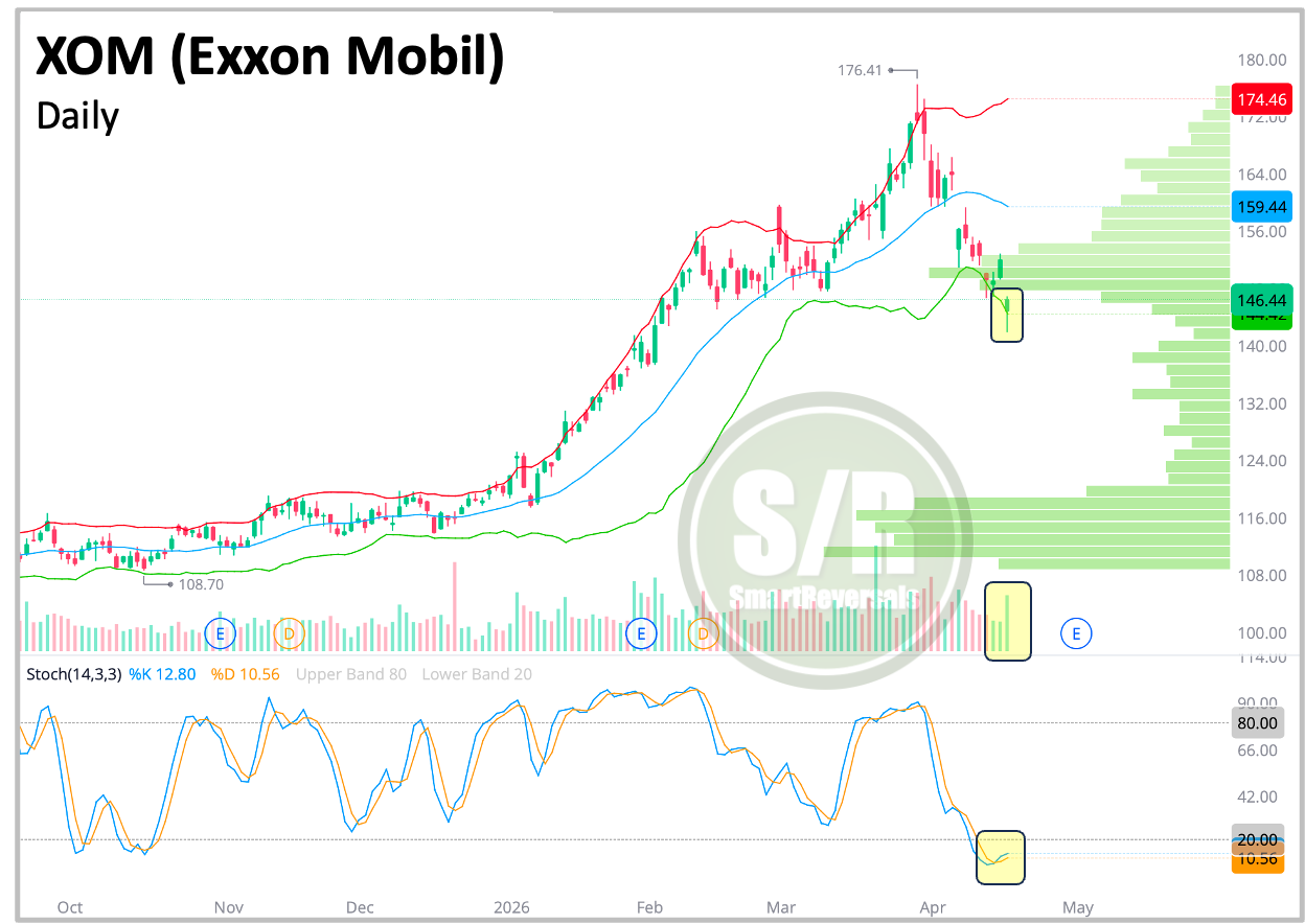 Hammer candle with high daily volume breaching the lower Bollinger band, oversold oscillator, a gap above today’s candle, and a gigantic gap when considering the volume at price (green horizontal bars). This is usually a good combination for a bounce.