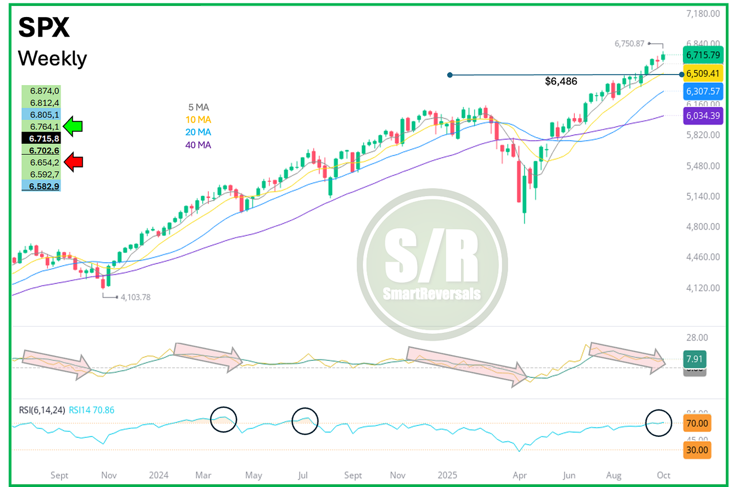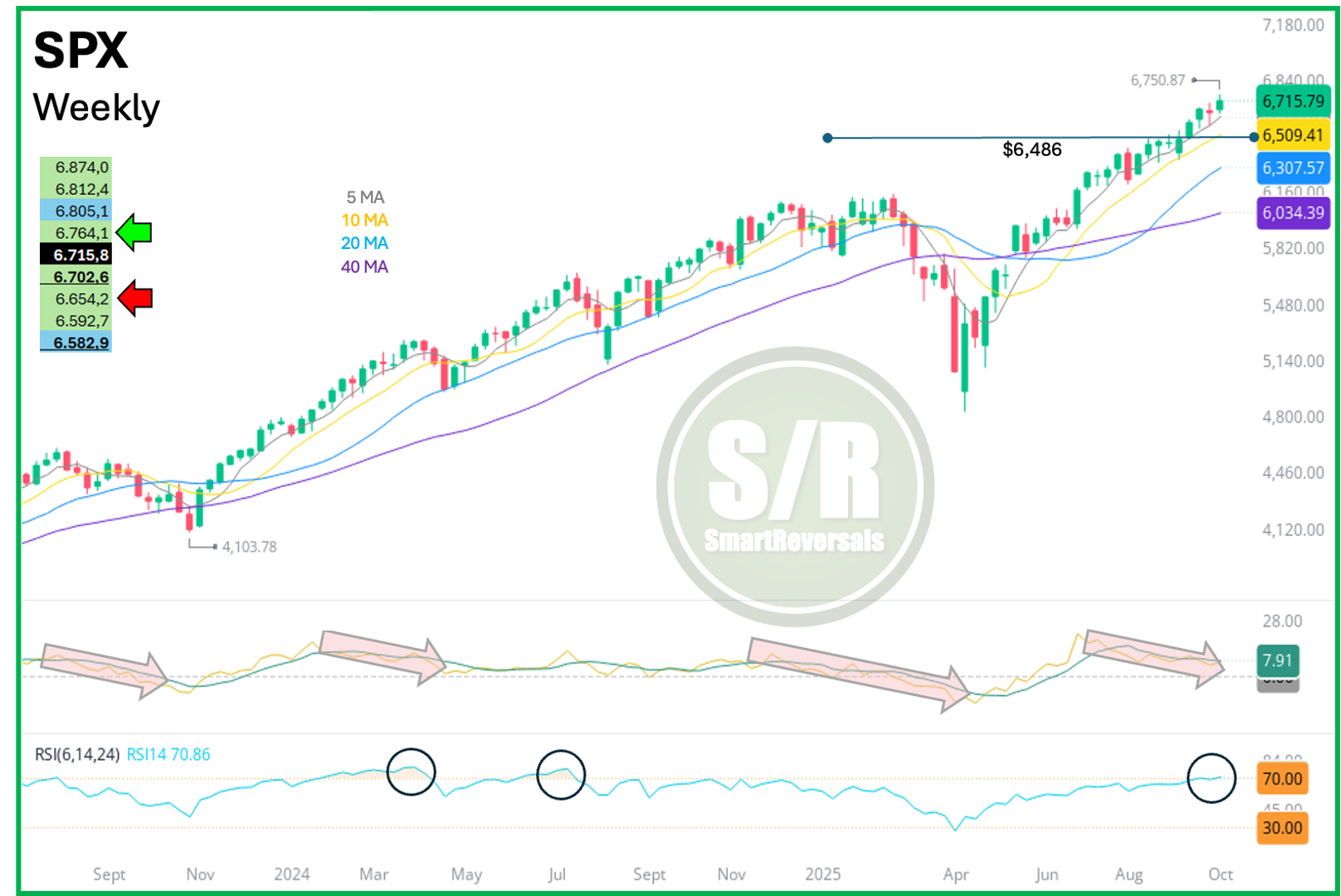 The following SPX chart was published last Sunday in the Weekly Compass, and apart from the overbought RSI and bearish divergence with the oscillator (both conditions that have anticipated a pullback in the recent past as highlighted), the chart showed at the top left a set of support and resistance levels. $6,702 is underlined since it is the central weekly level, the line that is modeled every weekend ahead of the new week, and that level is the one that makes a difference between bullish and bearish momentum.