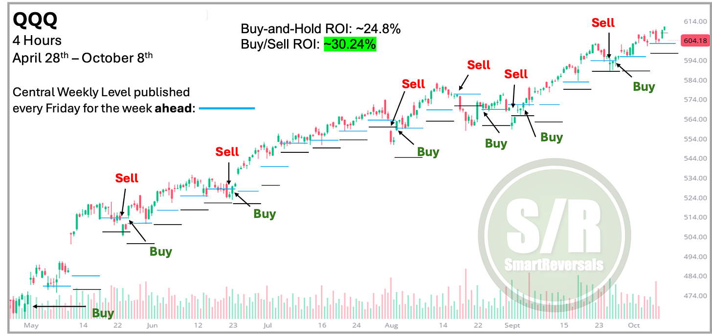 Trading and performance is not about perfection, it’s about following the process, since the levels are modeled every week and there are gaps or rapid moves that bring volatility to price. You can see some “Sell” and “Buy” signals that are highlighted in yellow; those cases show selling below the buy point, and buys above the previous sell point.