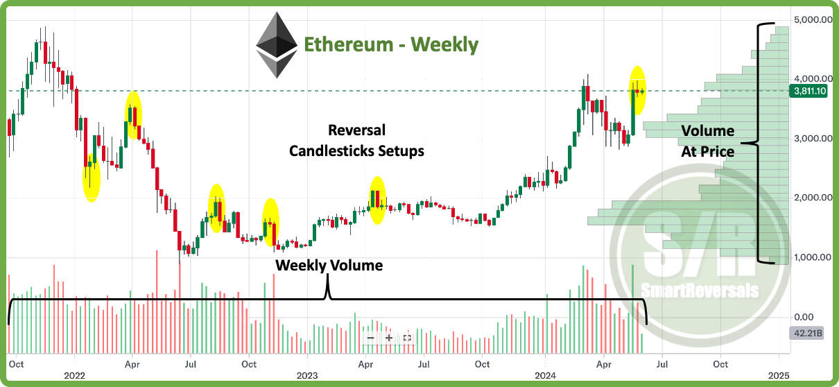 The weekly chart for ETH shows volume in a timeframe, candlesticks formations and the topic for today: Volume at Price.