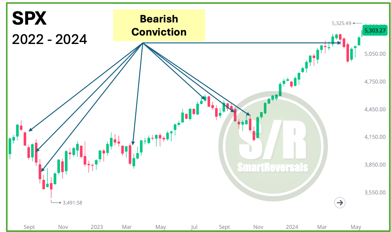 See the last part of the 2022 bear market, the -10% correction in 2023, and the healthy pullback in 2024, the candles have a solid red body that show a clear move after the opening.