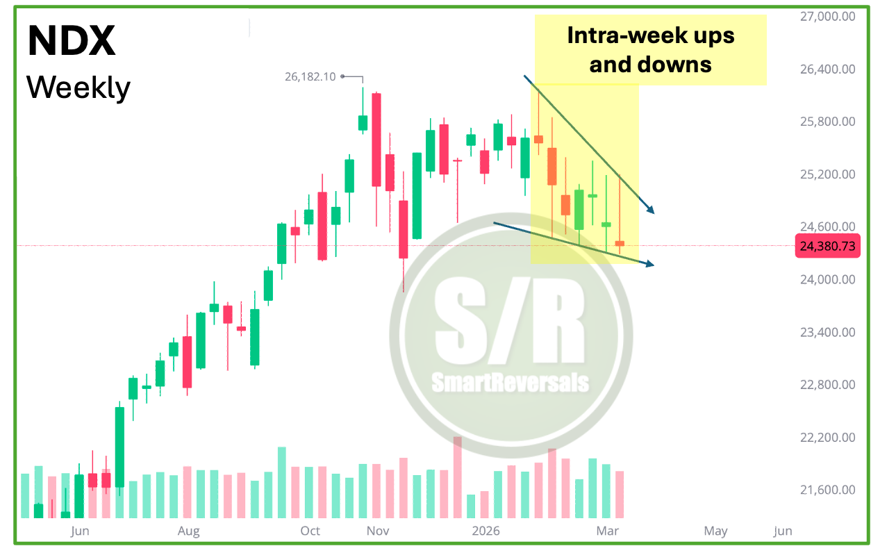 In the NASDAQ 100, the choppiness is even more pronounced. Instead of solid red or green candles, we see tiny “bodies” with long wicks to both sides. This convictionless price action exhausts both bulls and bears.