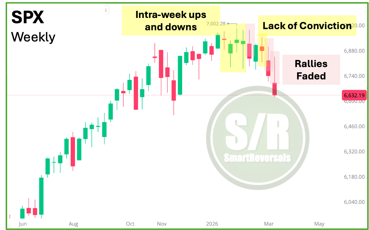 The stock market has been characterized by exceptionally choppy price action over the last seven weeks. We witnessed the S&P 500 and the NASDAQ go nowhere for three months, spanning the final quarter of 2025 through January 2026. That directionless route is found a resolution to the bearish side as anticipated at the end of January when this publication anticipated “Cracks Under the Surface”. However, the most striking feature of the current market is the lack of conviction.
